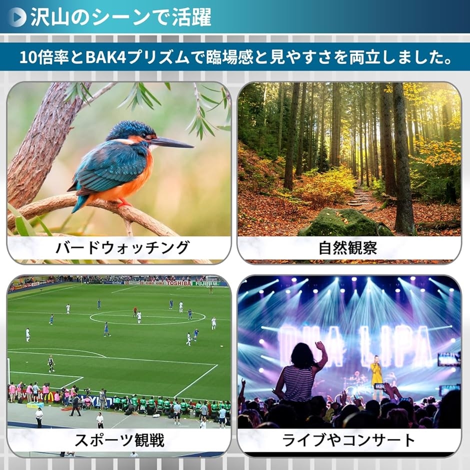 「こんな場面に・・」 ・お子様の発表会や試合など ・大好きなアーティストのライブやコンサート ・自然観察、バードウオッチング、スポーツ観戦 この双眼鏡があれば見たい瞬間を見逃しません。