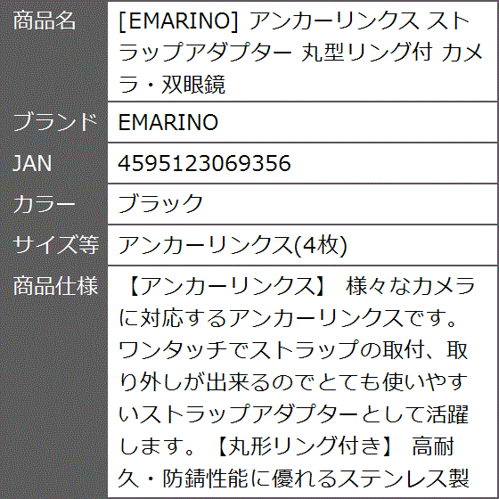 - 商品コード2b9n9t698d商品名アンカーリンクス ストラップアダプター 丸型リング付 カメラ・双眼鏡ブランドEMARINOカラーブラックサイズ等アンカーリンクス(4枚)「アンカーリンクス」 様々なカメラに対応するアンカーリンクスです。ワンタッチでストラップの取付、取り外しが出来るのでとても使いやすいストラップアダプターとして活躍します。「丸形リング付き」 高耐久・防錆性能に優れるステンレス製のリングを付属しているので取付部分が小さいカメラなどにも最適。リングは扱いやすく汎用性のある丸形を採用しているのでとても扱い安く簡単に取付が出来ます。「高耐久・高品質素材」高品質の編組ナイロンロープと耐衝撃性ABSバックルを採用しています。耐荷重は最大50kgあるので高重量なカメラを持ち運ぶ場合でも充分な耐久性を発揮します。「商品詳細」 *アンカーヘッド: 直径1.8cm *アンカーループ:全長4.0cm / 厚さ0.2cm *素材:ナイロン(PA66) *アンカーハウジング:全長5.0cm / 幅2.5cm / 厚さ0.9cm *本体重量:9.2g *素材:マンガン鋼 *丸型リング:304ステンレス製二重リング 直径10mmブランド:EMARINO※ 他ネットショップでも併売しているため、ご注文後に在庫切れとなる場合があります。予めご了承ください。※ 品薄または希少等の理由により、参考価格よりも高い価格で販売されている場合があります。ご注文の際には必ず販売価格をご確認ください。※ 沖縄県、離島または一部地域の場合、別途送料の負担をお願いする場合があります。予めご了承ください。※ お使いのモニタにより写真の色が実際の商品の色と異なる場合や、イメージに差異が生じることがあります。予めご了承ください。※ 商品の詳細(カラー・数量・サイズ 等)については、ページ内の商品説明をご確認のうえ、ご注文ください。※ モバイル版・スマホ版ページでは、お使いの端末によっては一部の情報が表示されないことがあります。すべての記載情報をご確認するには、PC版ページをご覧ください。
