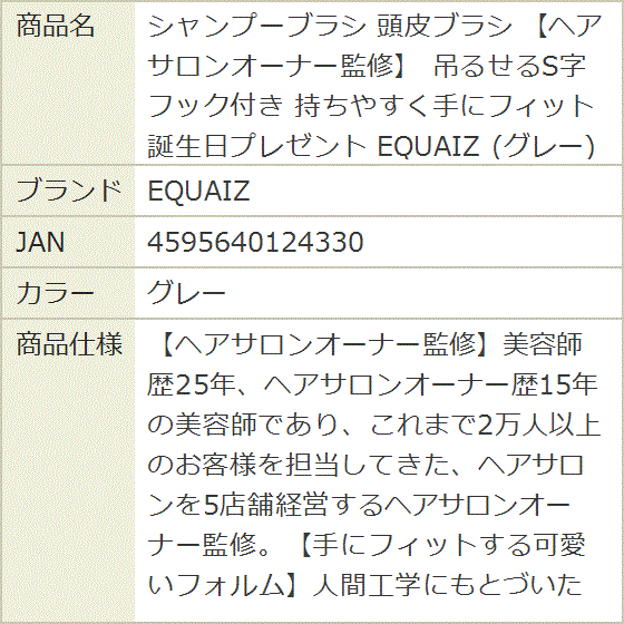 - カラー:グレー◆商品名:【美人百花に掲載】 シャンプーブラシ 頭皮ブラシ 【ヘアサロンオーナー監修】 吊るせるS字フック付き 持ちやすく手にフィット 誕生日プレゼント EQUAIZ (グレー)✅【ヘアサロンオーナー監修】美容師歴25年、ヘアサロンオーナー歴15年の美容師であり、これまで2万人以上のお客様を担当してきた、ヘアサロンを5店舗経営するヘアサロンオーナー監修。✅【手にフィットする可愛いフォルム】人間工学にもとづいた形状で手にフィットする可愛いフォルム。オシャレなバスタイムにも最適です。適度な弾力のある高品質シ リ コ ー ン素材なので滑りにくく、持ちやすいです。✅【S字フック付き】S時フックも付属しています。S字フックを使用して吊るして収納する事ができるので床置きよりもカビにくく、シャンプーブラシを清潔に保管する事ができます。✅【オシャレなパッケージでプレゼントにも最適】おしゃれなオリジナルデザインの化粧箱に入っているので、誕生日や記念日などのプレゼント、ギフトとしてもおすすめです。✅【商品詳細】バスグッズの雰囲気に合わせて選べる豊富な6カラー。商品サイズ:約7.5センチ×約7.5センチ。厚さ約1.4センチ。突起部約1.3センチ。材質:シ リ コ ー ン
