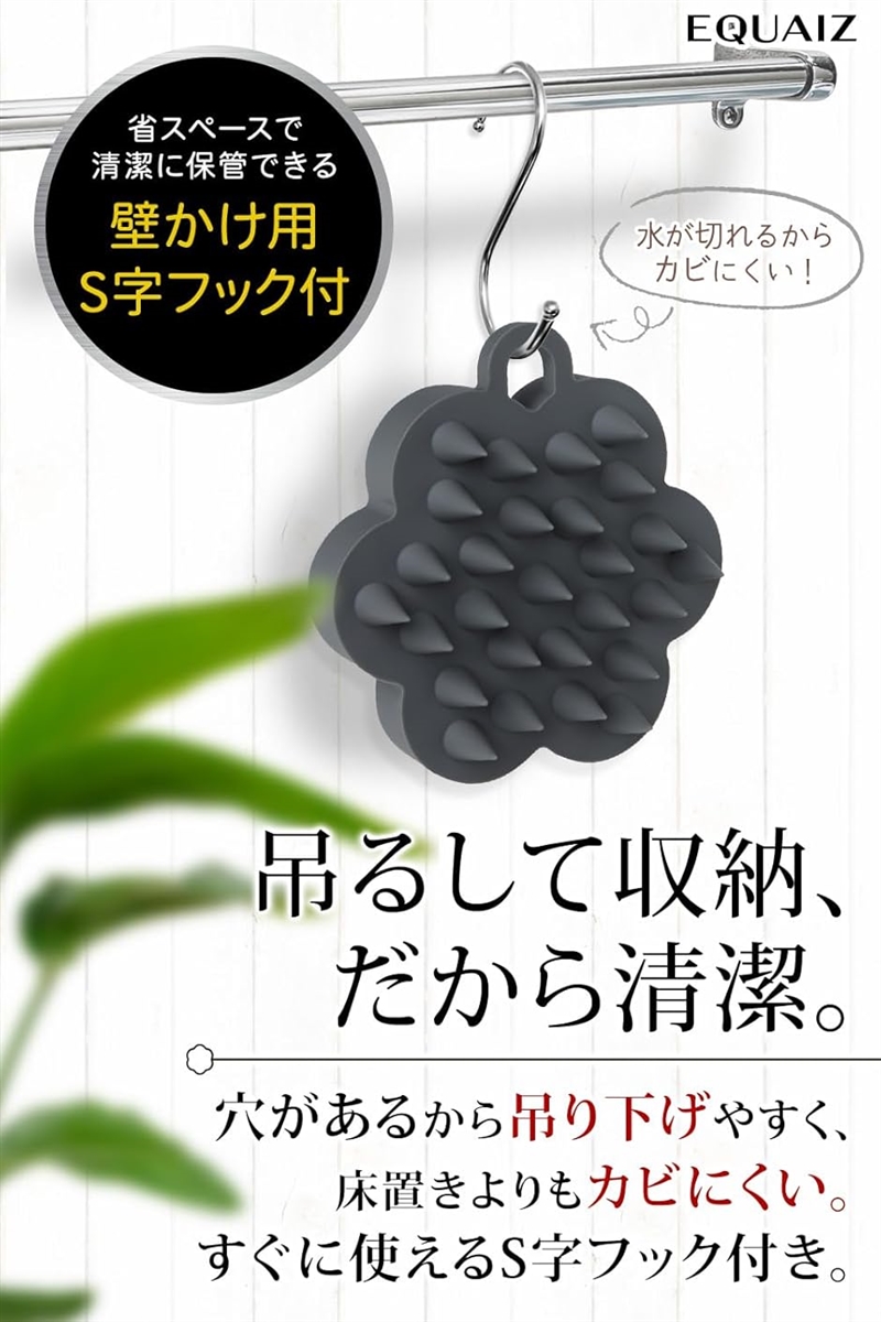 S字フックを使用して吊るして収納する事ができるので床置きよりもカビにくく、シャンプーブラシを清潔に保管する事ができます。