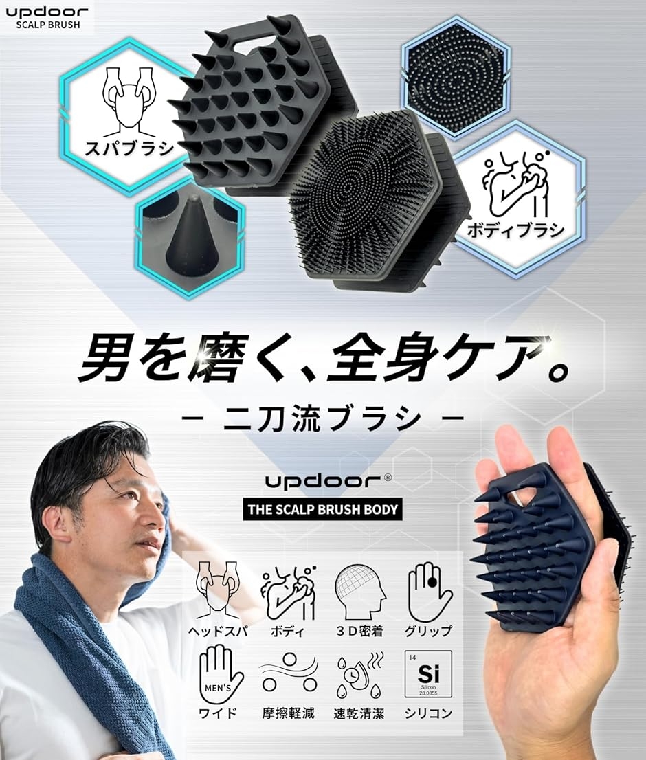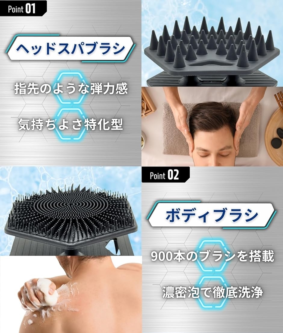 「男を磨く、全身ケア」両面にスカルプブラシとボディブラシを搭載。これ1つで全身ケア。