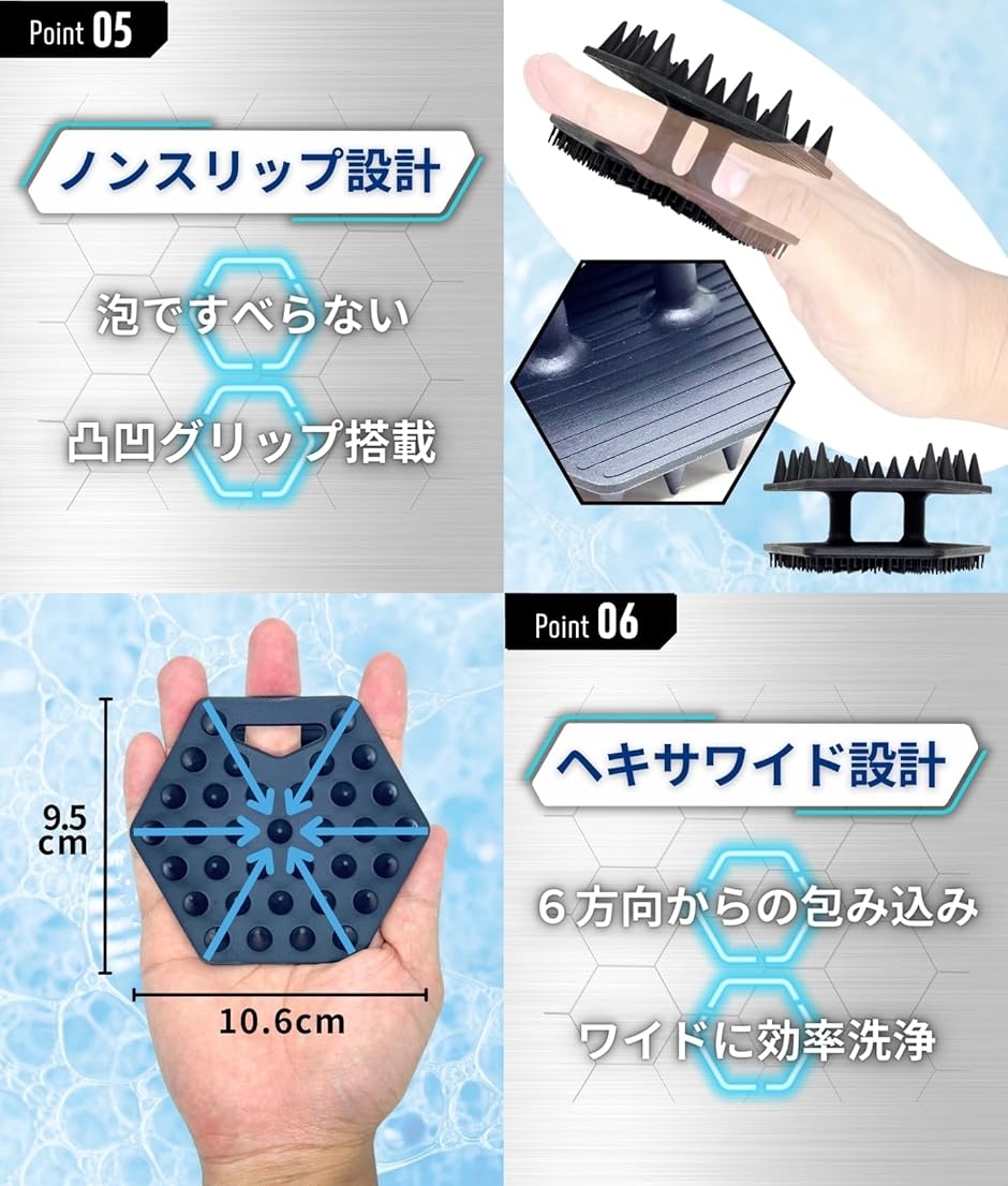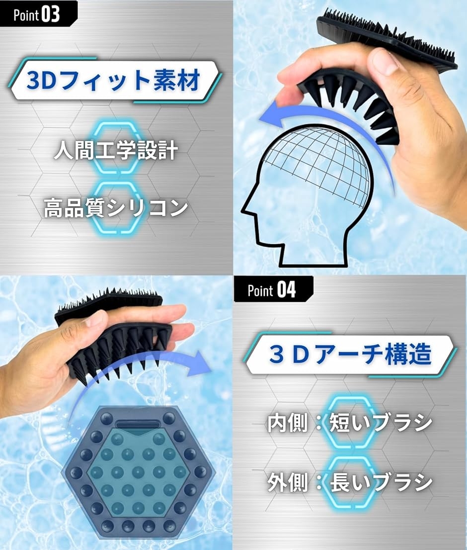 「3Dフィット素材」頭皮に吸い付くようなフィット感で効率的に洗髪。(シリコン素材)