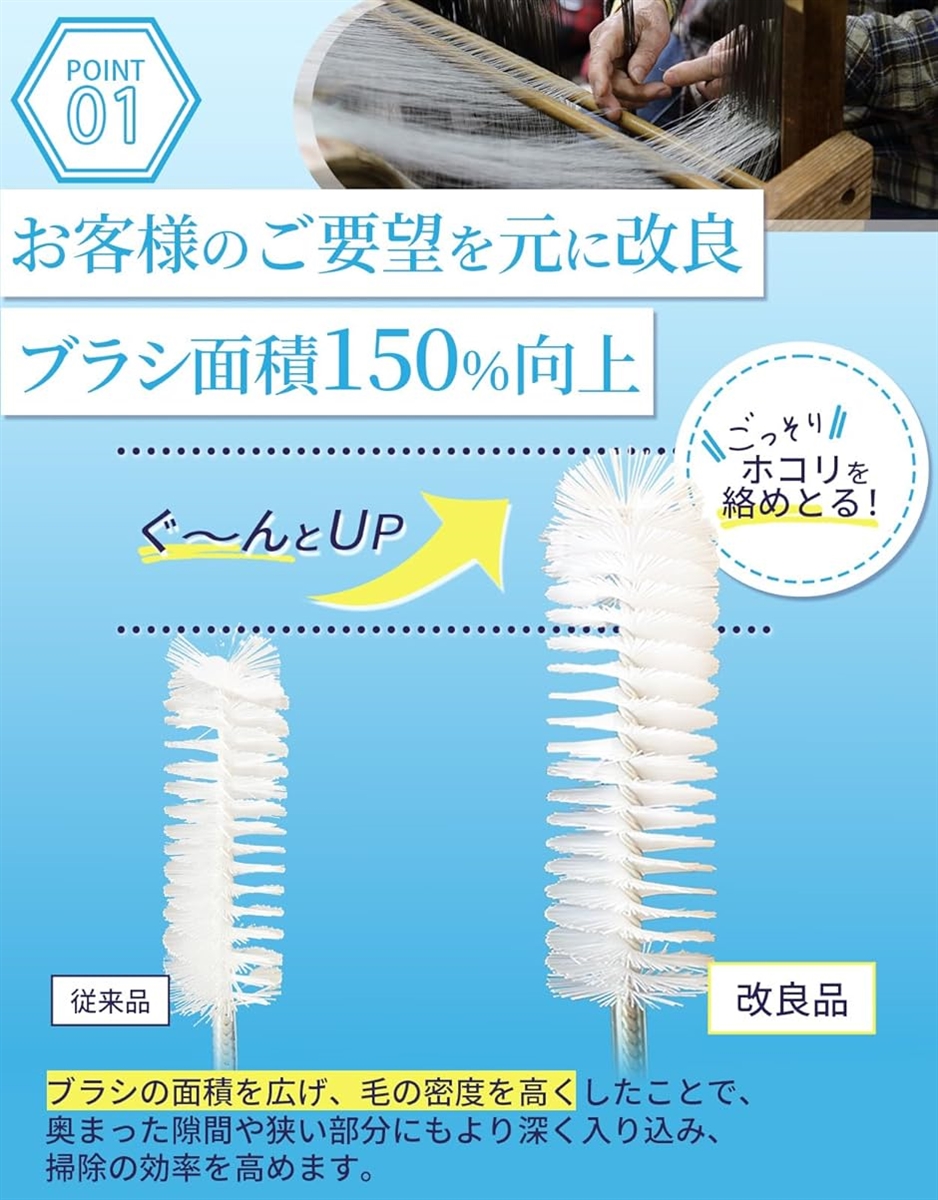 ブラシはステンレスと上質なナイロン素材が使用され、従来のブラシ面積を150%向上し、より効果的にお掃除を行うことができるよう改良しています。