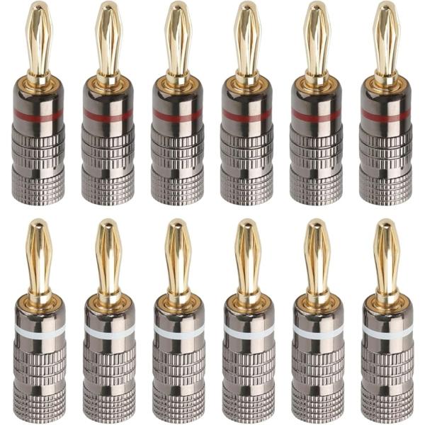 バナナプラグ 赤+白セット ソルダーレス 24k金メッキ 簡単取り付け ダブルネジ固定 12AWG〜18AWG対応(12個(6ペア))