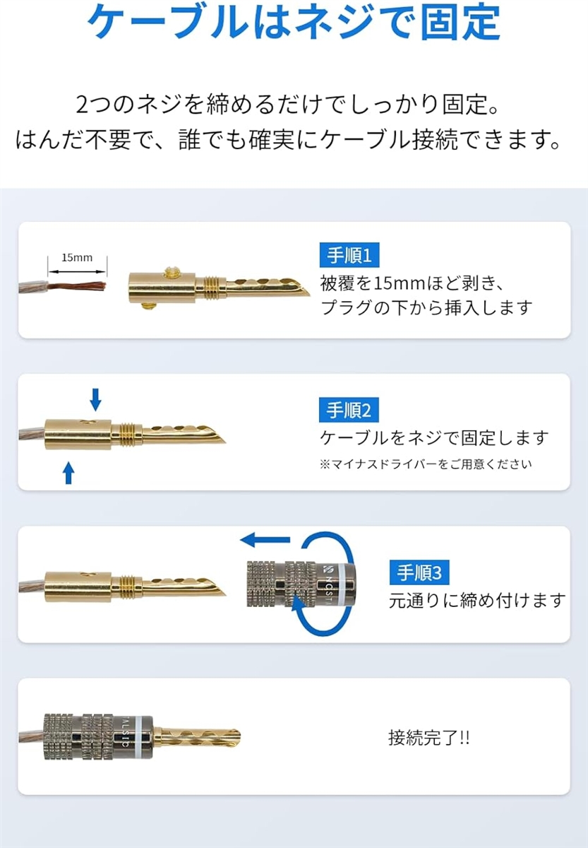 12〜18AWG相当のスピーカーケーブルに対応しています。