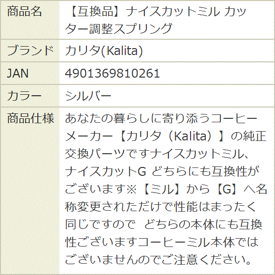 - 商品コード2b6qql3d9t商品名互換品ナイスカットミル カッター調整スプリングブランドカリタ(Kalita)カラーシルバーあなたの暮らしに寄り添うコーヒーメーカー「カリタ(Kalita)」の純正交換パーツですナイスカットミル、ナイスカットG どちらにも互換性がございます*「ミル」から「G」へ名称変更されただけで性能はまったく同じですので どちらの本体にも互換性ございますコーヒーミル本体ではございませんのでご注意ください。ネクストG、C-90など その他本体との互換性はございません。※ 他ネットショップでも併売しているため、ご注文後に在庫切れとなる場合があります。予めご了承ください。※ 品薄または希少等の理由により、参考価格よりも高い価格で販売されている場合があります。ご注文の際には必ず販売価格をご確認ください。※ 沖縄県、離島または一部地域の場合、別途送料の負担をお願いする場合があります。予めご了承ください。※ お使いのモニタにより写真の色が実際の商品の色と異なる場合や、イメージに差異が生じることがあります。予めご了承ください。※ 商品の詳細(カラー・数量・サイズ 等)については、ページ内の商品説明をご確認のうえ、ご注文ください。※ モバイル版・スマホ版ページでは、お使いの端末によっては一部の情報が表示されないことがあります。すべての記載情報をご確認するには、PC版ページをご覧ください。