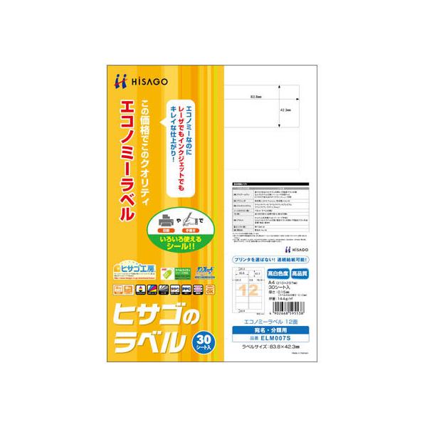ヒサゴ エコノミーラベル A4 12面 角丸 30枚 ELM007S マルチプリンタ対応ラベルシール 粘着ラベル用紙