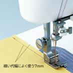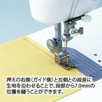 押えの右側(ガイド側)と左側との段差に生地を沿わせることで、段部から7mmの位置を縫うことができます。