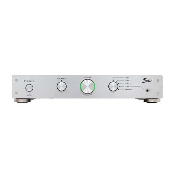 - フォノアンプ内蔵真空管プリアンプキット(真空管無し) TU-8550N 製品概要 TU-8550Nはフォノイコライザーアンプを内蔵した信号系全段真空管式のプリアンプキットです。 真空管は付属しておりません。別途、ご用意ください。 真空管は 12AX7 × 4本、12AU7 × 2本を使用 マイクロフォニックノイズの少ないものをご使用ください。 真空管が付属しているTU-8550もございます。 ■フォノイコライザーアンプは素直で滑らかな音質で定評のあるCR型RIAAイコライザー回路を採用 ■フラットアンプは、4連ボリュームを採用 パワーアンプの入力感度が低めの場合や、音源のレベルが低い場合にはプリアンプに高ゲインが要求されます。 しかし、プリアンプのゲインが高いとボリュームを絞った小音量時の残留ノイズが気になるというデメリットがあります。 そのため、本機では4連ボリュームを使用しボリュームを絞ると連動してアンプのゲインも低く(約1.4倍)、上げるとゲインも高くなる(約7倍)、ボリューム-ゲイン連動方式を採用し小音量時のノイズを低く抑えています。 ■ハムノイズを徹底排除 電源部では、B電源にファーストリカバリーダイオードによる整流、MOSFETによるスロースタートの安定化電源を採用。 またA電源 (ヒーター電源)もLDOレギュレータによる全球DC点灯式でハムノイズを徹底排除しています。 ■REC-OUTを搭載 セレクターで選ばれた信号がREC-OUTから出力されます。 録音機器への接続や本機のイコライザーアンプ出力を他のアンプで使いたい場合などにお使いください。 ■出力(PRE-OUT)は2系統 2台のパワーアンプへ接続が可能です。 ■大型のカップリングコンデンサへの交換が可能 直径20mm、長さ57mmまでのコンデンサの取り付けができるスペースを確保しています。 製品仕様 【回路構成、使用真空管】 フラットアンプ(ラインアンプ)部 2× 12AX7, 1× 12AU7 シングルエンド入出力 フォノイコライザーアンプ部 2× 12AX7, 1× 12AU7 CR型 RIAAイコライザーアンプ A電源 DC点灯(全球) B電源 MOSFET式 スロースタート定電圧電源 【フォノイコライザーアンプ部】 [最大出力電圧] 20Vrms(1kHz) [利得(1kHz)] 29dB [残留ノイズ] 50μV(IHF-A) [RIAA偏差] ±0.5dB以内 (20Hz~20kHz) [入力抵抗] 47kΩ(MM) 【フラットアンプ部】不平衡入出力、連続可変利得型 [最大出力電圧] 20Vrms(1kHz) [最大利得] 約17dB (約7倍) [周波数特性] 5Hz~200kHz(-3dB) [残留ノイズ] 15μV(IHF-A) 【全体】 [入出力端子] PHONO IN RCAジャック、MMカートリッジ用、47kΩ LINE IN 4系統 LINE 1, 2, 3 : RCAジャック LINE 4 3.5mmステレオフォーンジャック(前面) PRE OUT RCAジャック 2系統 (パラレル出力) REC OUT RCAジャック 1系統 [電源電圧] AC 100V 50/60Hz IEC規格3Pインレット式 [定格消費電力] 23W [本体寸法] W 352 × H 66 × D 298 mm (突起部含む) [本体重量] 約3.9kg(完成時)