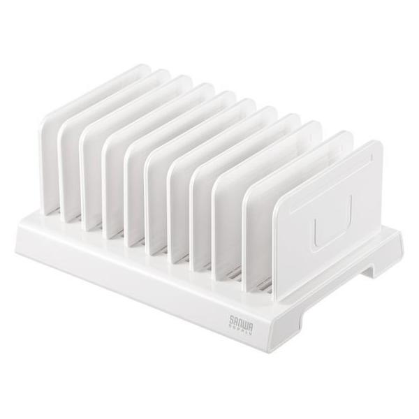 - SEARCH WORD:スマートフォン タブレット スタンド スマホ 収納 整理 台 オフィス 備品 アクセサリー iPhone アイフォン アイパッド iPad アンドロイド android 卓上 デスク商品概要:●設置機器に合わせて仕切板の取付位置を自由に調整できる、最大10台までの設置に対応したタブレット・スマートフォン用スタンドです。●仕切板は5mmピッチで自由に取付位置の調整ができるので、ケース付のタブレットや種類の異なる複数の機器の設置にも対応します。●省スペースに最大10台までの機器を設置することができます。●付属の連結板を使用することでスタンドを複数台連結することができ、設置台数を拡張することができます。●キズ防止用のクッションスポンジ付きで設置機器を保護します。●樹脂製のスタンドで設置機器にキズを付けにくく、安心して使用することができます。商品仕様:■メーカー:サンワサプライ■JANコード:4969887214848■商品名:タブレット・スマートフォン用スタンド(10台収納タイプ)■型番:PDA-STN20WN■サイズ:W125×D168×H22mm■重量:290g■材質:本体/ABS+PC、錘/鉄、すべり止めゴム/シリコーンゴム、仕切り板/ABS+PC、連結板/ABS+PC■対応機器台数:最大10台■セット内容:本体、仕切板×11個、連結板×1個、クッションスポンジシール■ご注意事項:商品画像はイメージです。色の濃淡は現物と異なる場合がございます。商品の色、配色、デザイン、仕様などは予告なく変更となる場合がございます。ご了承下さい。※商品概要、仕様、サービス内容及び企業情報などは商品発表時点のものです。※最新の情報に関しましては、メーカーサイトをご覧ください。※発売前予約商品についてはメーカーの商品製造数により納期が遅れる場合やご注文キャンセルをお願いする場合がございます。