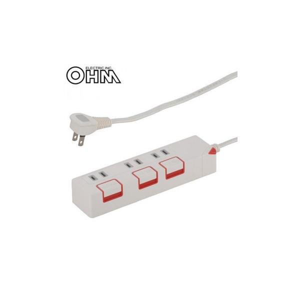 OHM 押しボタンスイッチ付き 節電タップ 3個口 2.5m HS-T1176W