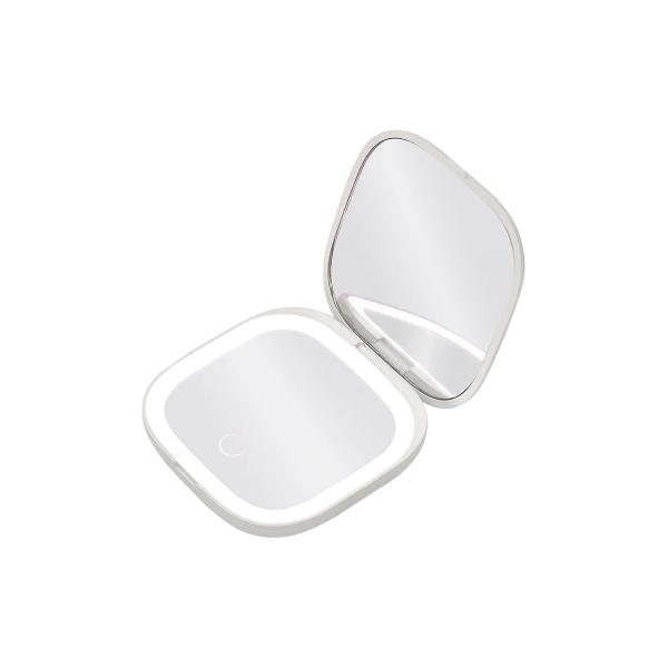 - 等倍と3倍拡大の2面ミラー等倍と3倍の拡大鏡で細部まで顔を確認できる。USB充電式TypeCコードレスタイプのUSB充電式で手軽に持ち運びが可能。LEDライトをつけてどこでも顔をチェック。コンパクトで持ち運びやすい手のひらサイズで持ち運びに最適。旅行や出張などはもちろん、通勤や通学バッグに毎日携帯できます。3パターンの調色機能と調光機能タッチセンサー(電源・ライト切替ボタン)で3パターンの調色が可能。タッチセンサーを長押しすると、明るさも自由に調光可能。【仕様】■本体サイズ:約90×90×16mm(閉じた状態)■本体質量:約100g■入力:USBTypeC/DC5V2A■バッテリー:リチウムイオン電池350mAh■充電/持続時間:満充電・約1.5時間、持続時間:約8時間■ミラーサイズ:約83mm×87mm■倍率:1倍/3倍仕様1●本体サイズ:約90×90×16mm(閉じた状態) ●本体質量:約100g ●入力:USB TypeC/DC5V 2A ●バッテリー:リチウムイオン電池 350mAh ●充電/持続時間:満充電・約1.5時間、持続時間:約8時間 ●ミラーサイズ:約83mm×87mm ●倍率:1倍/3倍家でも外でも手軽に使える3色LEDライト調色調光機能や持ち運びやすい手のひらサイズのコンパクトなミラー。お出かけ先でも素早くお顔をチェック。