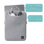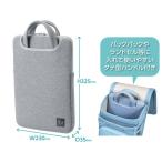- 周辺アクセサリーをまとめて収納できるタテ型ハンドル付きPCインナーバッグ【商品仕様】参考収容寸法:約W210×H305×D20mm外寸法:約W230×H325×D35mm(ハンドル含まず)重量:約340g材質:ポリエステル、ポリクロロプレン11.6インチまでのノートPCや周辺アクセサリー等をまとめて収納できるPCインナーバッグ。バックパックでの出し入れに便利なタテ型で、バッグへの出し入れや持ち運びに便利なハンドル付きです。弾力性のあるクッション材が、大切なノートPCを傷や衝撃から保護します。 11.6インチノートPCと周辺アクセサリーをまとめて収納 11.6インチまでのノートPCに対応しています。前面と背面のポケットにはマウスやケーブル等の周辺アクセサリーやメモなどを収納できます。 弾力性と伸縮性に優れた素材 ウェットスーツなどにも使用される、弾力性と伸縮性に優れたクロロプレンゴムをクッション材に採用しています。しっかりとしたクッション材が大切なノートPCを傷や衝撃から保護します。 バックパックに入れて使いやすいタテ型 バックパックやランドセル等に入れて使いやすいハンドル付きのタテ型インナーバッグです。 手持ちの移動に便利な弾力性のあるハンドル 手持ちでの移動やバッグへの出し入れに便利なハンドルは、長時間の移動でも手が痛くなりにくい、メイン素材と同じ弾力性のある素材です。 両開きファスナー 開け閉めがしやすい両開き(ダブルスライダー)ファスナーを採用。ノートPCの出し入れが容易に行えます。