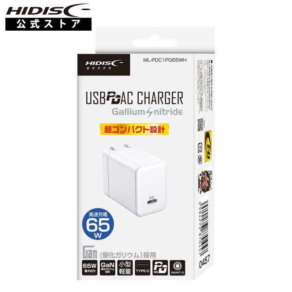 HIDISC GaN (窒化ガリウム)採用 超コンパクト設計 高速充電65W Type-C AC充電器 ML-PDC1PG65WH
