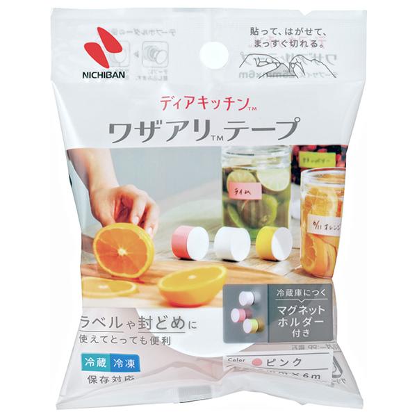 - 北海道・沖縄・離島へのお届けは別途送料がかかります。詳しくはこちらお得なセット販売ニチバン DearKitchen ディアチキ ワザアリテープ DK-WAN2511H ホルダー付手で簡単に切れ、貼ってはがせる水に強いフィルム素材のテープです。これまで使用シーンに応じて粘着テープ、ラベル、輪ゴム、クリップなどを使い分けていたところを、この製品一つで済ますことができます。食品の袋の封どめはもちろん、保存容器やフリーザーバッグの日付・内容物のラベルなど、様々な用途にお使いいただける「ワザアリ」な製品です。 ●色:ピンク●テープサイズ:幅25mm×長さ6m●ワザアリテープ専用マグネットタイプのホルダー付●基材:ポリエチレンクロス●粘着剤:アクリル系I am easily sharp by hand and am tape of the film material which is strong in water to put it, and to be able to tear off. I can settle it with one this product until now when I use adhesive tape, a label, a rubber band, a clip properly depending on a use scene. It is the product which is "ワザアリ" to be able to use for various uses including the label of a date, the contents of seal どめはもちろん of the bag of the food, a preservation container and the freezer bag. ●A color: Pink ● tape size: ● base material with holder of the magnet type for exclusive use of 25mm in width X 6m in length ● ワザアリテープ: Polyethylene cross ● adhesive: Acrylic systemHow to order in shopping cart