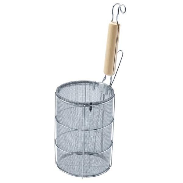 - 『スパゲティ麺用』の茹でザルです ◆ロングパスタに対応する縦型 ◆大・小・スリムの3サイズ展開 調理するスパゲティの量に合わせてお選びできます ◆丈夫で衛生的なステンレス製網 ◆手になじんで握りやすい木製ハンドル ワイヤーが熱くなっても手に触れにくい設計、安心です [ 仕様 ] ◇網部:幅φ130×深さ190mm ◇柄長:190mm ◇重量:440g ◇材質 網・ワイヤー:18-8ステンレス 柄:木柄 ◇網部メッシュ(開き目):16メッシュ(1.1) ◇日本製