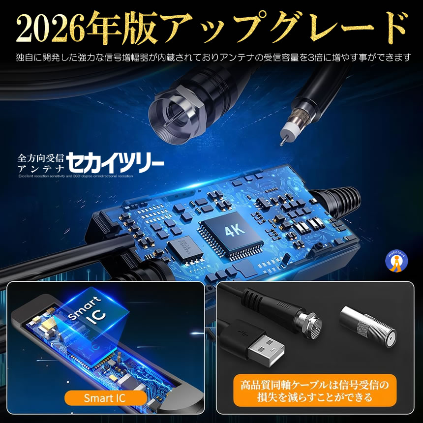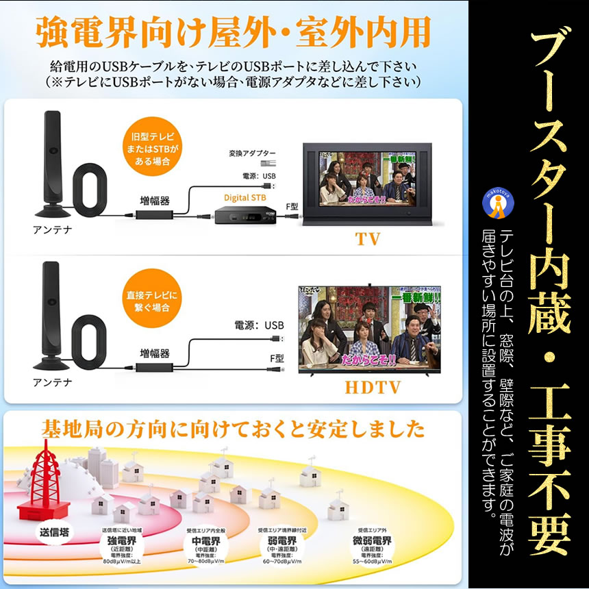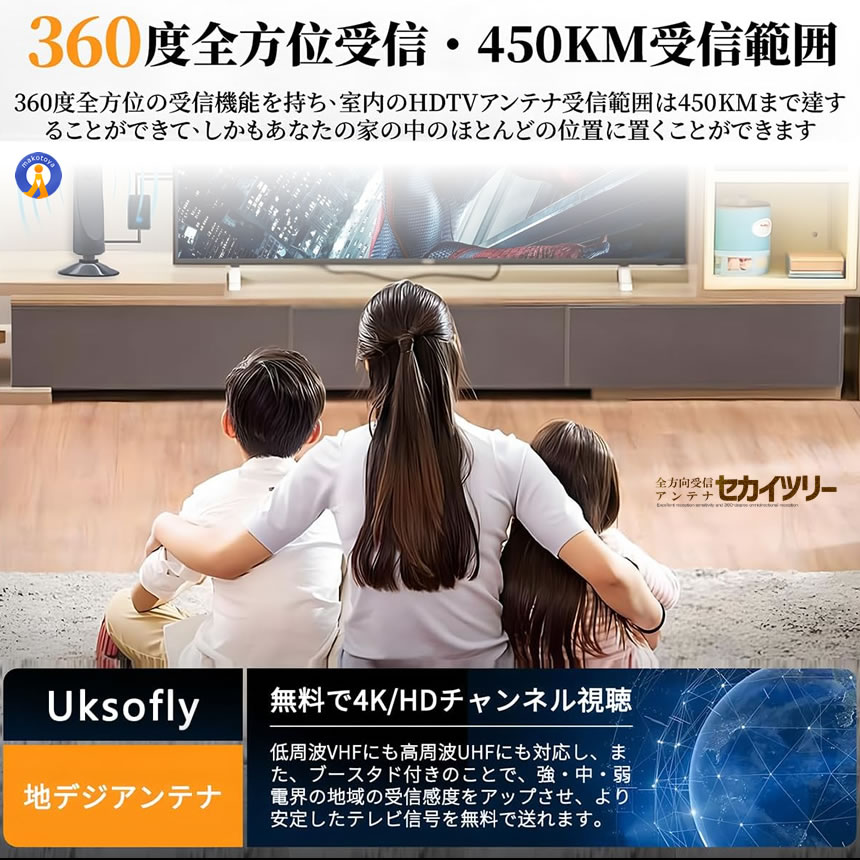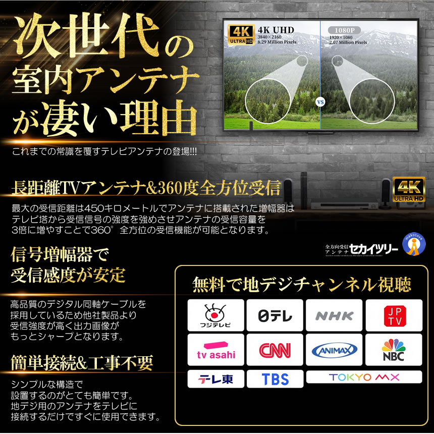 2個セット テレビアンテナ 全方位受信 室内アンテナ 地デジアンテナ ブースター 増幅器 360度 450KM受信範囲 SPACETREE 爆買