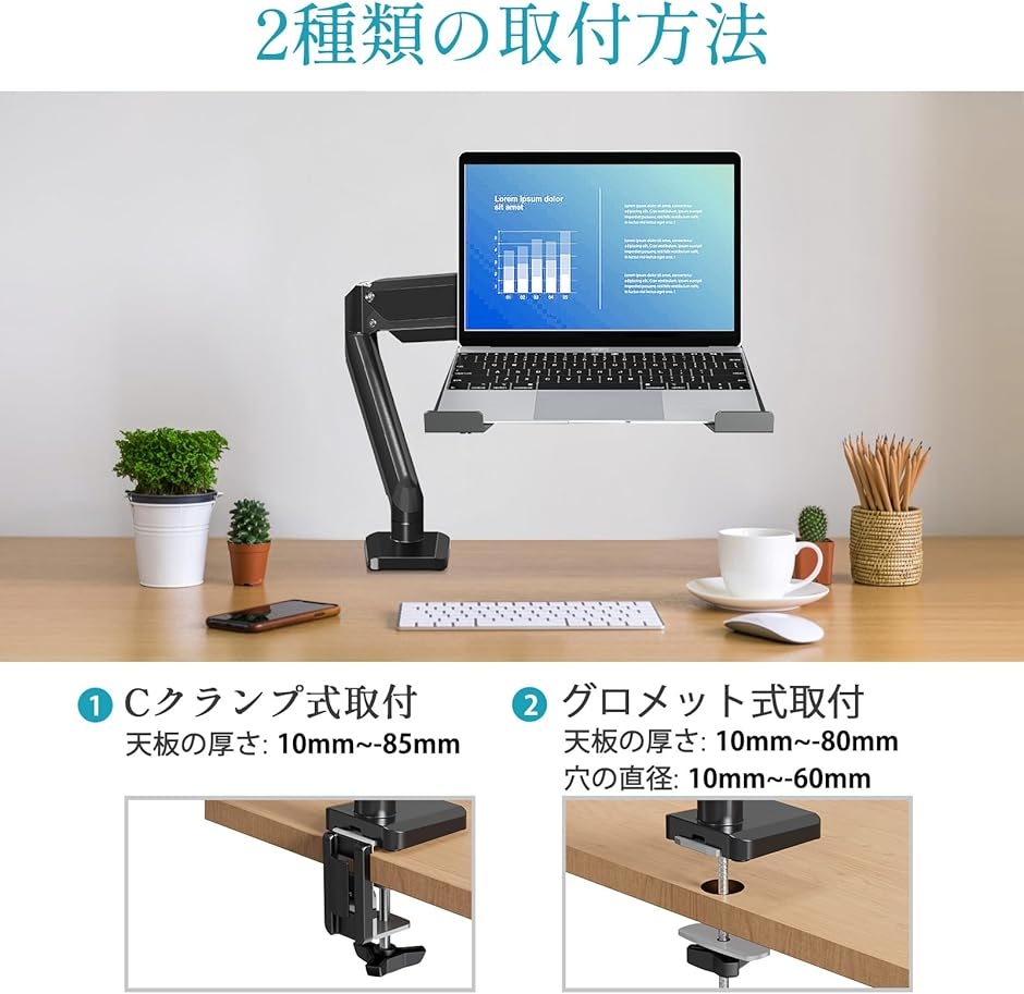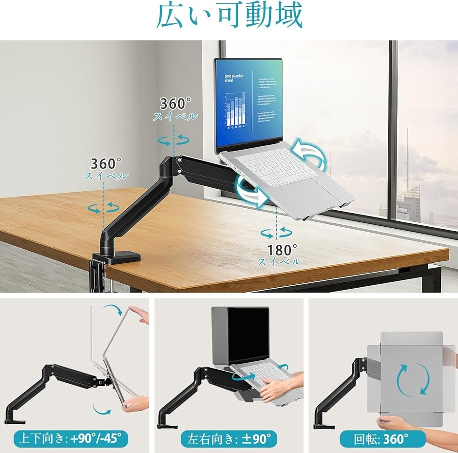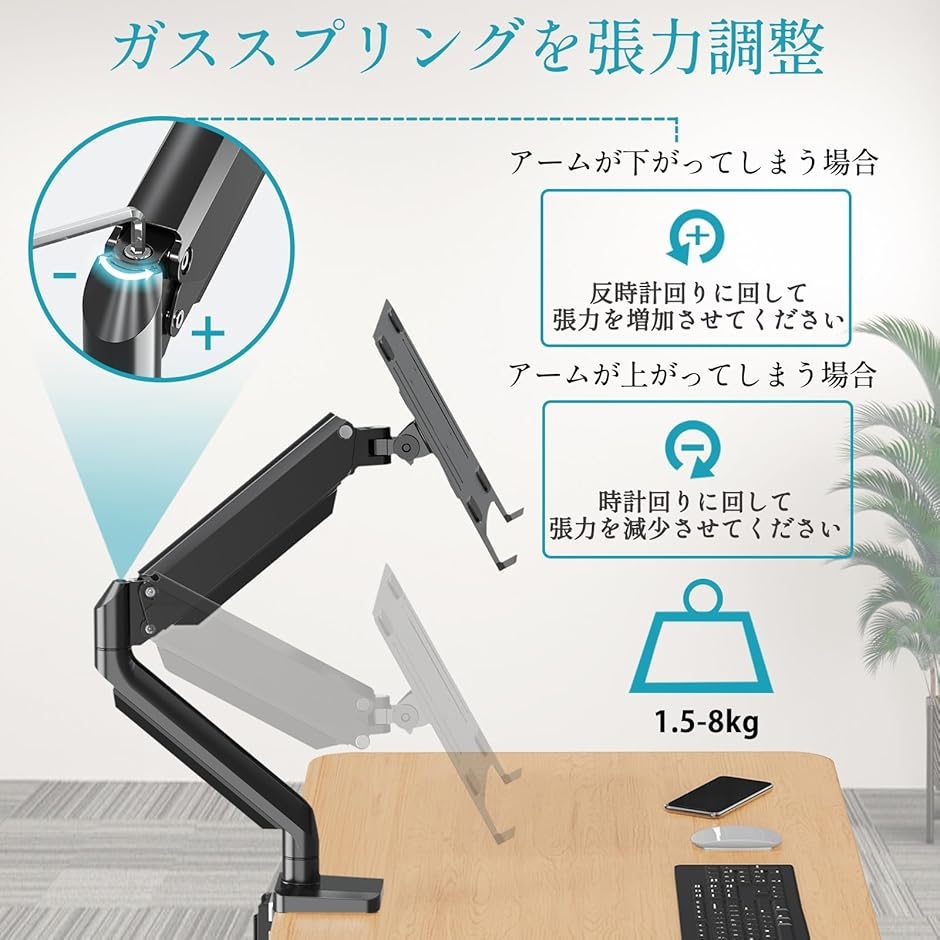 ノートパソコンアーム ガススプリング式 レイ付き 17インチ対応 耐荷重8kg モニターアーム 15.6インチ MDM (ブラック, 2XL)