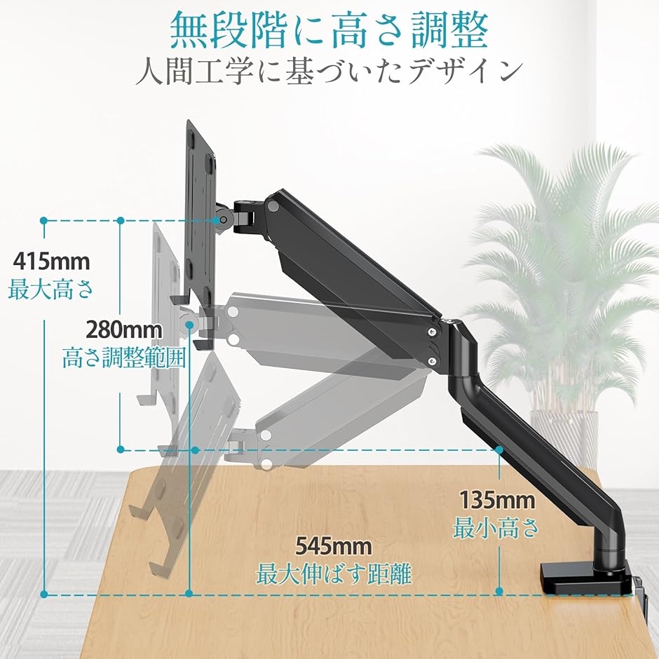 「ガススプリング内蔵」ガス圧式アームにより、軽い力でノートパソコンを上下左右および前後に移動でき、ネジの緩めや締めといった手間は必要ありません。