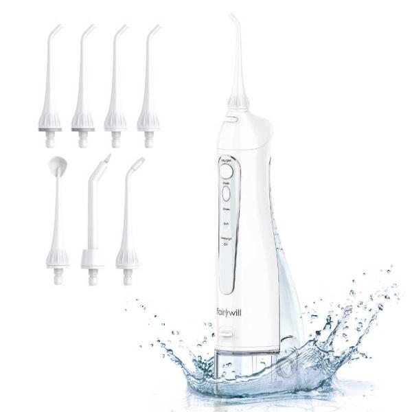 - 商品説明 ブランドFairywill(フェアリーウィル) 製品仕様 バッテリー:USB充電 フル充電時間:約4時間 【内容品】 本体 替えノズル×4/舌クリーニングノズル/歯科矯正用クリーニングノズル/歯肉用クリーニングノズル 充電ケーブル 説明書 防水規格:IPX7級 主な機能 【口腔洗浄欧米で絶賛口腔洗浄器】 優れた材質で作られた口腔洗浄器は毎分1400~1800回の高い頻度で、強力なジェット水流によって歯ブラシ、糸ようじなどが届きにくい箇所までしっかり洗浄でき、歯周・歯ぐき洗浄に役立ちます。 【操作簡単三つモード】 シンプルな二つの操作ボタン。1つは電源ボタンで、一回押すと、電源がON/OFFになります。もう1つはモードボタンで、クリーン/ソフト/マッサージの三つの水圧モードに切替できます。お好みのモードを自由にご選択してください。お子様、初心者には「ソフト」モードをお勧めます。 ・クリーンモード 約1800回/分の高い頻度で、強力なジェット水流によって歯間の汚れをしっかり洗浄します。 ・ソフトモード 約1400回/分のジェット水流で敏感な歯茎に穏やかに洗浄します。 ・マッサージモード 約1400~1800回/分のジェット水流で歯茎を洗浄します。 【300ML大容量タンク7本ノズル】300ML大容量タンク搭載、水を頻繁に交換する必要がありません。タンクは取り外し可能で、タンクとリフィル内部を簡単に掃除することができます。替えノズルが7本付いております。360°回転可能なノズル設計により、歯ブラシの届きにくい所まで洗浄できます。 【特殊ノズル3本】 7本の替えノズルのうち、3本は特殊ノズルになります。 1舌クリーナー:細菌を除去し、息をさわやかにします。 2歯肉クリーナー:歯周のクリーンに最適です。 3矯正器具クリーナー:矯正器具の間の食べかす等を除去します。 4通常ノズル:日々のクリーニングに。 【USB充電IPX7防水】 充電時間約4時間。フル充電で約21日間使用できます。短距離旅行の際は、フル充電した本体さえ持っていけば十分です。本体は防水設計で丸洗いできます。(ただし長時間に水に浸したままにしないでください。) 【携帯便利】片手で握れるコンパクトサイズで、持ち運びが楽々です。