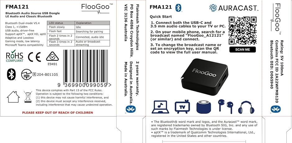 - Auracastブロードキャスター認定設計のLEオーディオが補聴器にも対応aptX、aptX HD、aptX Adaptive with Losslessに対応デュアルモード:Classic BluetoothとLEオーディオソースを1つのデバイスで使用可能専用ファームウェアを搭載したUSB Auracastレシーバーモードプラグアンドプレイ対応のUSBオーディオインターフェース。Windows、Mac、Linuxに対応し、ドライバーのインストールは不要。ゲーム機にも対応。※ 他ネットショップでも併売しているため、ご注文後に在庫切れとなる場合があります。予めご了承ください。※ 品薄または希少等の理由により、参考価格よりも高い価格で販売されている場合があります。ご注文の際には必ず販売価格をご確認ください。※ 沖縄県、離島または一部地域の場合、別途送料の負担をお願いする場合があります。予めご了承ください。※ お使いのモニタにより写真の色が実際の商品の色と異なる場合や、イメージに差異が生じることがあります。予めご了承ください。※ 商品の詳細(カラー・数量・サイズ 等)については、ページ内の商品説明をご確認のうえ、ご注文ください。※ モバイル版・スマホ版ページでは、お使いの端末によっては一部の情報が表示されないことがあります。すべての記載情報をご確認するには、PC版ページをご覧ください。技術基準適合証明番号:204-B01105FMA120/FMA121は、スマートフォン、ノートパソコン、テレビ、Switchなどのゲーム機、その他のオーディオ機器など、幅広いデバイスのアップグレードを目的として設計された、デュアルモードBluetooth 5.4 USBオーディオドングルです。aptX AdaptiveやAuracastブロードキャストオーディオなどの高度な機能を追加するほか、音楽と音声の両方でLE Audioユニキャストをサポートします。さらに、Bluetooth Classicヘッドセット、スピーカー、イヤホンとの互換性を維持し、様々なデバイス間でシームレスな接続を実現します。