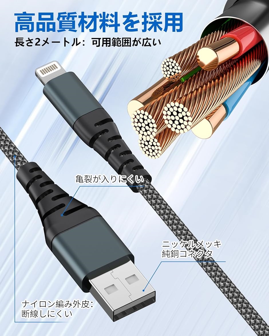 「高耐久ナイロン編み外皮&耐腐蝕コネクタ設計」ライトニングケーブルはナイロン編み外皮を採用し、亀裂発生を強力に抑制。