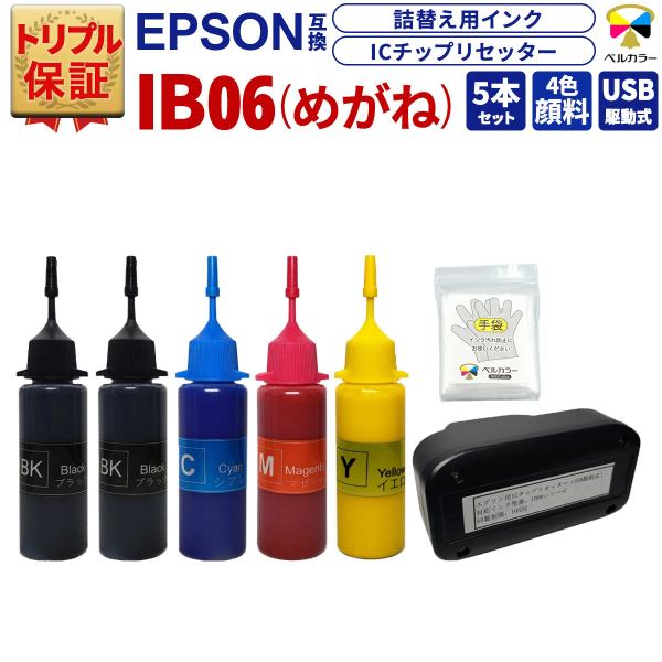 トリプル保証 エプソン 互換 ICチップリセッター 詰め替え用 互換インク 4色セット IB06 めがね PX-S5010 PX-S5010R1 対応 全色顔料 USB駆動式 ベルカラー