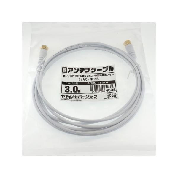 極細アンテナケーブル 3m ホワイト 両側ネジ式コネクタ ホーリック AC30-483WH (65-1793-06)