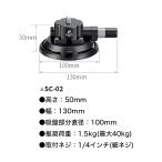 【SC-02】主な仕様 高さ:50mm 幅:130mm 吸盤部分直径:100mm 推奨荷重:1.5kg 重量:200g 取付ネジ:1/4インチ(細ネジ)