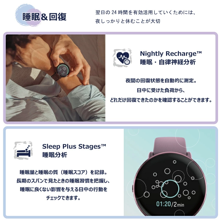 ●高解像度タッチディスプレイ、睡眠・活動量の自動計測機能を搭載。