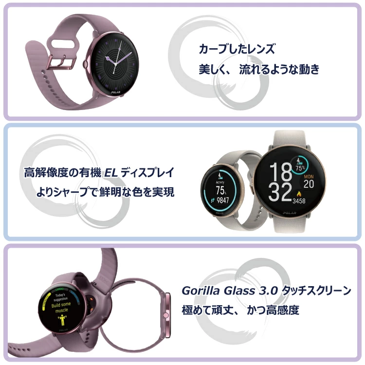 ●高精細有機ELで美しく!GPS・心拍計で健康を可視化。