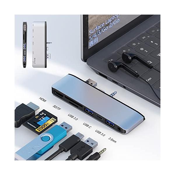 - ✅【Surface Laptop 5/4/3/ Laptop Go 2/Go専用USB ハブ】このSurface laptop USBハブはSurface Laptop 5/4/3とSurface Laptop Go 2/Go専用で、ワイヤ レス設計により、デスクトップを雑な状態にならない。4K@30Hz HDMI ポート + 2つUSB 3.0 ポート + USB-C ポート +SD / TFカードリーダー+ 3.5mmオーディオポートに拡張しました。注:Surface Laptop 5/4/3/ Go2/Go だけのために作られた仕組みなので、ほかのMircosoft surfaceシリーズにご使用いただけないことは予めご了承ください。使用する際、Surface機器本体に保護ケース付けないでください。)✅ 【Surface laptop 5用4K HDMIアダプター】このSurface laptop 5 HDMIハブは最大4K@30Hzのビデオ解像度をサポートし、逆方向は2K / 1080p / 720p / 480p / 360p解像度をサポートします。ノートパソコンの高解像度4KUHD @ 30HzまたはフルHD1080PビデオをHDMIポート経由でHDTV、モニター、またはプロジェクターに自由に表示して、超高精細の視覚的な楽しみを提供します。✅ 【高速データ転送】 USB3.0ポート最大5Gbps転送。内蔵のSD/TF スロットにより、ユニバーサルマイクロSDメモリカードのファイルに最大480Mbpsの超高速で簡単にアクセスできます。 SDXC、SDHC、SD、MMC、RS-MMCおよびMicro SD、TF、Micro SDXC、Micro SDHCをサポートします。Type Cポートは最大480Mbpsでのデータ転送が可能です。注:USB Cポートは充電できません。 SD/TF カードを同時に読み込み&書き込みません。 )✅ 【Surface laptop Go 専用 3.5 mmオーディオ ポート】3.5mmオーディオ ポートが付き、簡単に聞く、話す、録音することができます。プラグアンドプレイ。 【 対応機種】Surface laptop Go 2;Surface laptop Go 1 ;Surface laptop 5;Surface laptop 4;Surface laptop 3。✅【高品質 】このSurface laptop4 usbハブの特別な斜角側とコンパクトなデザインは、Surface laptop Go 2/1;Surface laptop 3/4/5 と完全に一致します。軽量で出張や出張に便利です。 プラグアンドプレイで、ドライバーは必要ありません。