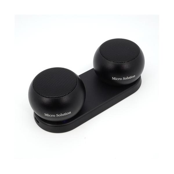 - マイクロソリューション MSWSP3D-BL セパレートステレオスピーカー ブラック●小さな本体ですが音割れしにくい小型のスピーカーで、さらにセパレートタイプの良さが、よりステレオ効果が臨場感溢れ楽しませてくれるはずです。●付属のプレートに載せるだけで充電でき、そのまま使用することも出来ます。●本体の大きさは φ50 x 33mm 70g、 小さなお店や部屋のなかでさりげなく奏でるスピーカーとして最適です。【仕様】送信周波数20HZ-20KHZS/N比80DB〜スピーカーパラメーター4Ω 3W diameter 36mmBluetooth Bluetooth 4.2バッテリー容量3.7V/ 200mAh (lithiumpolymer battery)電圧DC 5V (Micro USB-B)サイズφ50 x 33mm重量70g商品構成本体 x 1、USB mini B Cable x 1
