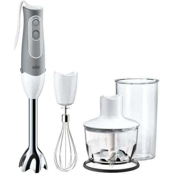 - 3)1台4役 マルチクイック5・ホワイト/グレー MQ535GY・独自開発したドイツ品質のモーターハンドブレンダーの命ともいえるモーターは、ブラウンが独自開発したドイツ品質。350Wでスピーディーに調理が出来ます。・2段階のスピード設定と操作しやすい大き目のボタン搭載大き目のボタンは片手でスピードが切り替えられて、調理を中断する必要がありません。・全面ソフトグリップ採用持ち手が滑りにくい全面ソフトグリップ採用。・さらに人間工学に基づいた握りやすい形状で、手元に負担がかかりにくい設計です。・食材の種類に応じて2段階のスピード調整が可能です。説明 「つぶす」「混ぜる」に加え「きざむ」「泡立てる」が付いた、離乳食やスムージーづくりから毎日のお料理まで、デイリーに使えるモデルです。