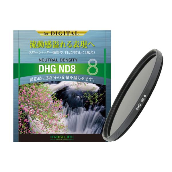 - DHG NDフィルターは光量をコントロールし、シャッタースピードが調整できるフィルターです。露出オーバーの白とび防止や、絞りすぎによるデジタル画像の画質低下防止に適しています。被写体の色彩に影響をあたえることなく光量だけを落とすので、スローシャッターや絞りに慣れていないカメラビギナーの方でも、いつもとは違う写真表現ができます。絞り相当:3段 光量:1/8