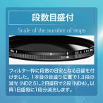 - 2枚の偏光膜を使い、濃度を無段階に変えることができるNDフィルターです。一眼カメラでの動画撮影や、ポートレート、風景撮影などに幅広くお使いいただけます。前枠を回転させることで減光量を調整します。撮影状況の変化に応じて適切な露出をシームレスに得ることができます。また減光量の目安となる段数目盛を付けることで、目的の濃度を素早く正確に設定できて便利です。初めてお求めになる方にも、安心してご使用いただけます。