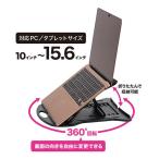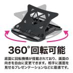 - 360°回転可能なノートPC・タブレットスタンド ノートPCやタブレットを置いて360°回転できるスタンドです。 底面に回転機構が搭載されており、画面の向きを自由に変更できます。 相手に画面を見せるプレゼンテーションなどに最適です。 7段階の角度調節が可能 7段階の角度調節機能を搭載しており、22°/29°/32°/37°/41°/43°/45°の角度から、 お好みの角度をお選びいただけます。 使用シーンに応じて適切な角度で作業ができます。 コンパクトに折りたためる 折りたたむことで厚みをわずか約22mmに抑えることができます。 コンパクトに収納でき、邪魔になりません。 目線を高くすることで肩や腰への負担を軽減 通常、ノートPCの画面をみるときは、目線が下がり、腰や肩に負担がかかってしまいます。 本製品は画面の高さを最適に合わせ、腰や肩への負担を軽減します。 ※外付けキーボードを併用するとさらに快適です。 対応端末サイズ 10インチ〜15.6インチのノートPC、タブレット端末等 (上記サイズは目安です。端末の形状や、底面のデザインにより使用できない場合がございます。) 材質 ABS、シリコン 耐荷重 約5kg 設定角度 7段階(22°/29°/32°/37°/41°/43°/45°) サイズ 使用時:約W280×H280×D160mm 折りたたみ時:約W280×H280×D22mm 本体重量 約587g 保証期間 ご購入日より6ヶ月(保証を受けるには、レシートなどの購入証明が必要です。)【送料無料】メール便での発送予定となります