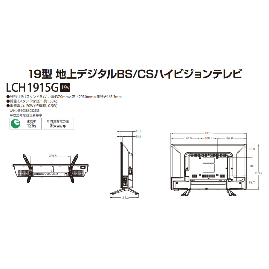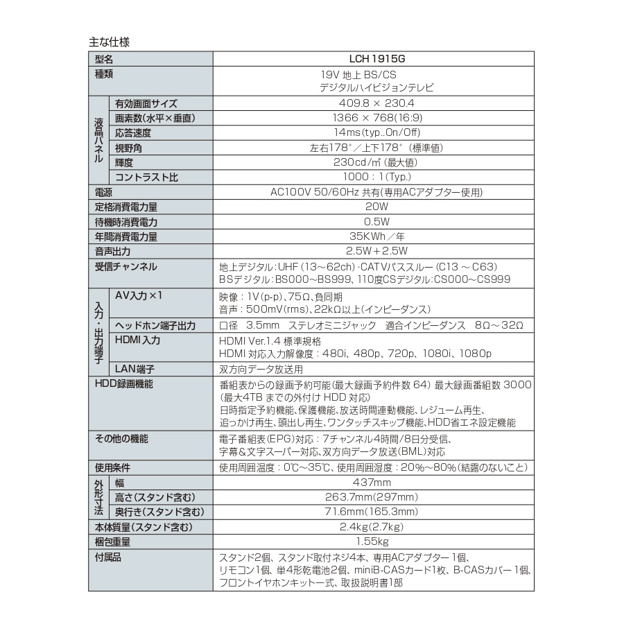 - ■ ユニテク(UNITECH) ■Visole 19V 地上 BS/CS デジタルハイビジョンテレビ◆ 主な特長 ◆基本機能充実のベーシックハイビジョンモデル●地上デジタル・BS/CSデジタルチューナー搭載(外付けHDD留守録対応)●直下型LEDバックライト・ARC対応・CEC連動●基本をおさえた入出力端子●HDMI入力端子×2、コンポジット入力端子×1、光音声デジタル出力端子×1、●LAN端子(双方向データ放送用)●見やすい電子番組表(EPG)◆ 主な仕様 ◆■型名:LCH1915G■種類:19V型 地上 BS/CS デジタルハイビジョンテレビ■液晶パネル有効画面サイズ 409.8×230.4 / 画素数 1366×768(16:9) / 応答速度 14ms(typ..On/Off)視野角 左右178°・上下178°(標準値) / 輝度 230cd/m2(最大値) / コントラスト比 1000:1(Typ.)■電源・電力:AC100V 50/60Hz(専用ACアダプター) / 定格消費電力 20W / 待機時 0.5W / 年間消費電力量 35KWh/年■音声出力:2.5W+2.5W■受信チャンネル地上デジタル:UHF(13〜62ch)・CATVパススルー(C13〜C63)BSデジタル:BS000〜BS999 / 110度CSデジタル:CS000〜CS999■入力・出力端子AV入力×1(映像:1V(p-p)、音声:500mV(rms))ヘッドホン端子出力(3.5mm ステレオミニジャック / 適合インピーダンス 8Ω〜32Ω)HDMI入力(Ver.1.4 標準規格 / 対応解像度:480i, 480p, 720p, 1080i, 1080p)LAN端子(双方向データ放送用)■HDD録画機能最大録画予約件数 64 / 最大録画番組数 3000(最大4TB外付けHDD対応)日時指定予約、保護機能、放送時間連動、レジューム再生、追っかけ再生、頭出し再生、ワンタッチスキップ、HDD省エネ設定■その他機能:EPG(7チャンネル4時間/8日分) / 字幕・文字スーパー対応 / 双方向データ放送(BML)対応■使用条件:周囲温度 0℃〜35℃ / 周囲湿度 20%〜80%(結露なきこと)■寸法・質量外形寸法:幅437mm × 高さ263.7mm(297mm) × 奥行71.6mm(165.3mm) ※()はスタンド含本体質量:2.4kg(スタンド含 2.7kg) / 梱包重量:1.55kg■付属品スタンド2個、取付ネジ4本、専用ACアダプター、リモコン、単4電池2個、miniB-CASカード、B-CASカバー、フロントイヤホンキット一式、取扱説明書簡易商品仕様カラー:-シリーズ名:Visoleブランド名:ユニテクメーカー型番:LCH1915Gテレビ画素数:ハイビジョンTVディスプレイサイズ(型):19外付けHDD録画:有代表カラー:ブラックディスプレイタイプ:液晶