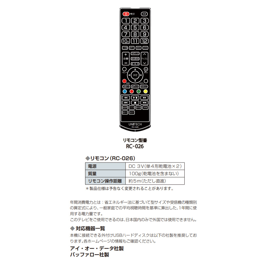 ■付属品:スタンド2個、 スタンド取付ネジ4本、 専用ACアダプター1個、リモコン1個、 単4形乾電池2個、 miniB-CASカード1枚、 B-CASカバー1個、フロントイヤホンキット一式、 取扱説明書1部