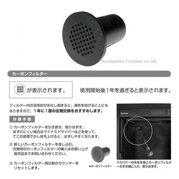 - ユーロカーブはカーボンフィルタを通して常時庫内に空気を取り入れています。 それにより、湿度の調整など、空気の浄化以外にも役立っています。 中の活性炭が劣化して固まると、通気を妨げて臭いがこもったり、湿度が不安定になりかねませんので、1年毎の交換をオススメいたします。 交換目安:1年毎 ワインセラー本体と一緒にご購入される場合は、送料無料! ※クレジットカード、前払い銀行振込決済のみとなります。 ※ラッピング不可商品