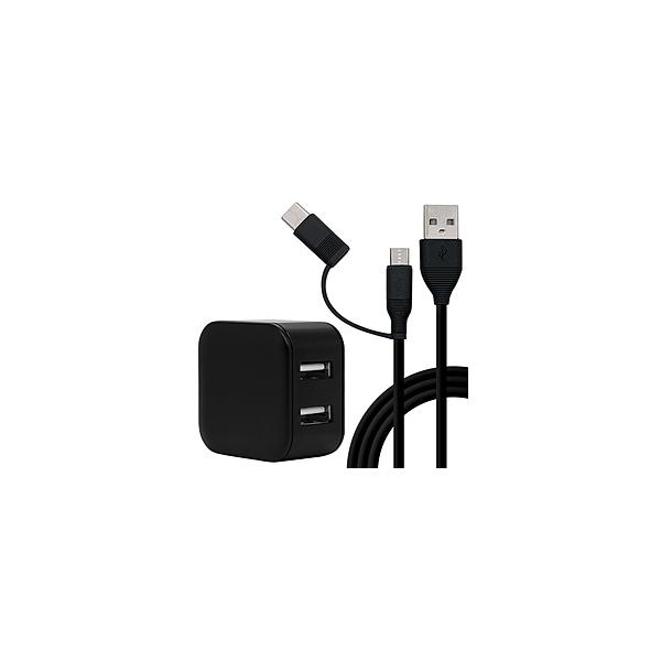 - 本製品は、Type-C変換アダプタ付きUSBケーブルとUSB Type-Aポートを2個搭載した最大出力 5V/2.4AのAC充電器のセット製品です。