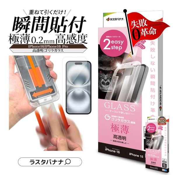iPhone16 16 Pro 15 ガラスフィルム 平面保護 高光沢 干渉しない 薄型 0.2mm ゴリラガラス採用 レボリューションガラス 瞬間貼り アイフォン ラスタバナナ