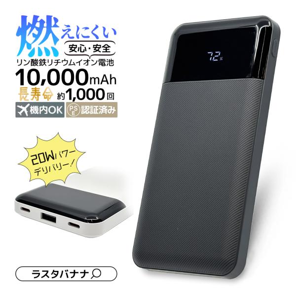 モバイルバッテリー 10000mAh 3ポート タイプC 20ワット タイプA USB Type-C PD 電池残量ディスプレイ 長寿命 安全 リン酸鉄 リチウム電池 iPhone ラスタバナナ