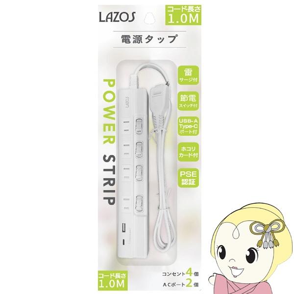 電源タップ1m AC×4口 USB-A×1口 TypeC×1口 LAZOS 節電スイッチ付き L-PS-10 延長コード USBポート付き 1m