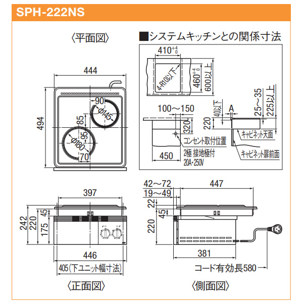 - ■ 三化工業 ■プレートヒーター ビルトイン2口(200Vタイプ)◆ 主な特長 ◆●プレートヒータータイプヒーターが鋳鉄製だから丈夫で熱伝導に大変優れてます。また、保温性抜群で余熱も充分利用出来て、節電&節約になります。優れたローコストなので、一人暮らしのアパートやオフィスのキッチンに最適です。●ロータリー式つまみ◆ 主な仕様 ◆■型名:SPH-222NS■色:シルバー■定格:単相200V(50/60Hz)-3500W■大きさ:幅446×奥行き569×高さ242mm■重さ:約14.0kg■右ヒーター:直径:145mm消費電力:1500W火力調節:135〜1500W 6段階調節■左ヒーター直径:180mm消費電力:2000W火力調節:175〜2000W 6段階調節■コード:2.0平方mm3芯キャブタイヤコード 長さ0.58m■差し込みプラグ:2極・接地極付 20A・250V簡易商品仕様シリーズ名:-ブランド名:三化工業メーカー型番:SPH-222NS代表カラー:シルバーコンロ口数:2本体奥行:569mm本体横幅:446mm本体高さ:242mm