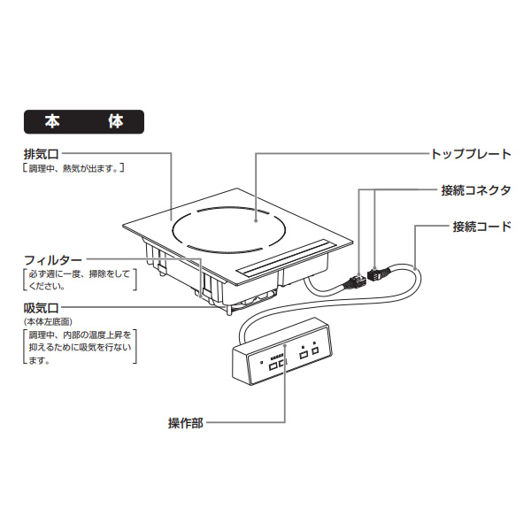 - ■ 三化工業 ■ビルトイン型 客席IHヒーター (100Vタイプ) 操作部吊り下げ専用品 SIH-TH113BD-BK◆ 主な特長 ◆●フルフラットのIHなので段差ゼロ!カセットコンロと違って火が無く、段差がないので、なべの食材も取りやすく安心、安全です。また、近くにお飲み物をおいても温まりにくいです。● 操作部吊り下げ専用品◆ 主な仕様 ◆■型名:SIH-TH113BD■色:ブラック(BK)■定格:100V-1300W■大きさ:本体:幅320×奥行き320×高さ100.5mm■操作部:幅190×奥行き46×高さ58mm■重さ:約3.6kg■ヒーター消費電力:5段階切替え 300W(相当)・500・700・1000・1300W■コード:2.0mm 2芯ゴム平形コード 長さ2m■差込みプラグ:2極 15A・125V■安全機能:・切り忘れ防止:最終操作後約45分で自動OFF・鍋なし検知:鍋底センサーが鍋なしを検知し自動停止・温度過昇防止:空炊きなどにより、なべ底の温度が異常に上がると、自動的にヒーターの通電が止まります。その場合、電源スイッチを押し再度操作をし直してください。※火力が弱い場合や、なべの種類によっては通電が切れない場合があります。※炒め物などの高温料理をしたときに働くことがあります。・過熱防止:吸・排気口がふさがれたりして内部が異常に高温になると、自動的にヒーターの通電が止まります。温度が下がると自動で復帰します。・高温注意ランプ:調理中トッププレートが熱い間は高温注意ランプが点灯し、電源を切った後もトッププレートが熱い間は点滅しつづけてお知らせします。簡易商品仕様シリーズ名:-ブランド名:三化工業メーカー型番:SIH-TH113BD-BK代表カラー:ブラックコンロ口数:1