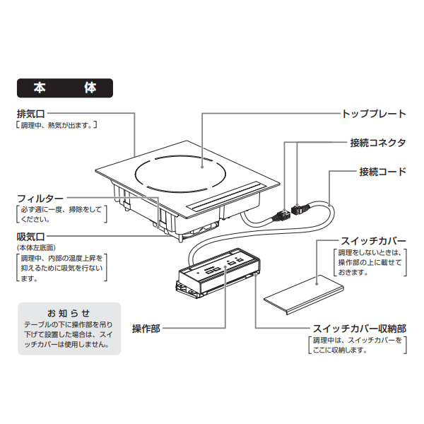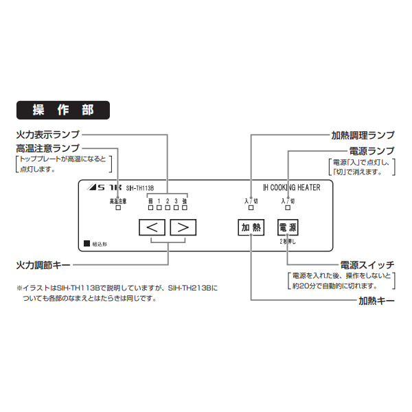 - ■ 三化工業 ■ビルトイン型 客席IHヒーター (100Vタイプ)SIH-TH113B-BK◆ 主な特長 ◆●フルフラットのIHなので段差ゼロ!カセットコンロと違って火が無く、段差がないので、なべの食材も取りやすく安心、安全です。また、近くにお飲み物をおいても温まりにくいです。●操作部の設置方法は2通り見た目をスッキリさせる埋め込み式とテーブル加工がなく施工が簡単な吊下げ式があります。◆ 主な仕様 ◆■型名:SIH-TH113B■色:ブラック(BK)■定格:100V-1300W■大きさ:本体:幅320×奥行き384×高さ100.5mm■操作部:幅189.5×奥行き80×高さ55.5mm■重さ:約4.3kg■ヒーター消費電力:5段階切替え 300W(相当)・500・700・1000・1300W■コード:2.0mm 2芯ゴム平形コード 長さ2m■差込みプラグ:2極 15A・125V■安全機能・切り忘れ防止:最終操作後約45分で自動OFF・鍋なし検知:鍋底センサーが鍋なしを検知し自動停止・温度過昇防止:空炊きなどにより、なべ底の温度が異常に上がると、自動的にヒーターの通電が止まります。その場合、電源スイッチを押し再度操作をし直してください。※火力が弱い場合や、なべの種類によっては通電が切れない場合があります。※炒め物などの高温料理をしたときに働くことがあります。・過熱防止:吸・排気口がふさがれたりして内部が異常に高温になると、自動的にヒーターの通電が止まります。温度が下がると自動で復帰します。・高温注意ランプ:調理中トッププレートが熱い間は高温注意ランプが点灯し、電源を切った後もトッププレートが熱い間は点滅しつづけてお知らせします。簡易商品仕様シリーズ名:-ブランド名:三化工業メーカー型番:SIH-TH113B-BK代表カラー:ブラックコンロ口数:1