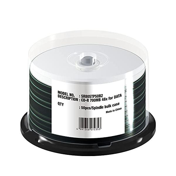 - サーマル印刷用-/CD-R(50枚)/SR80STP50B2・Size:CD-R(50枚)Style:サーマル印刷用・パッケージ個数:1・品種:データ用 CD-R・容量:700MB・1回記録用・盤面印刷:サーマルプリント用*インクジェット不可 / 範囲:22mm-118mm(ワイド)・倍速:48倍速、ケース:スピンドルバルクケース、入り数:50枚1回記録用CD-R/48倍速記録対応/700B/サーマル印刷用 スピンドルバルクケース入り うまく書き込めなかった時は・・・ ・ディスクに汚れ(指紋・ほこり等)はありませんか? ・書き込み機器(PC・レコーダー)のファームウェアは最新ですか? 上記を確認の上、万一当社の製造上の原因による品質不良がありました場合は、ご購入後1年以内に限り、同数の新しい製品とお取り替えいたします。 ご購入日を示す納品書やレシートをご準備いただき、サポートセンターまでご連絡ください。 ※記録内容の復旧/補償は行っておりません。 (お問合せ先/日本総代理店 株式会社アイ・オー・データ機器) ・電話番号:050-3116-3022 受付時間:9:00~17:00 月~金(祝祭日を除く)