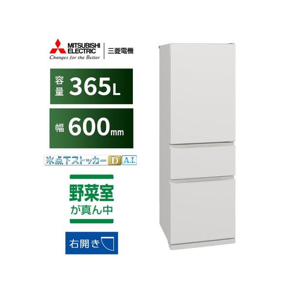 三菱電機 冷蔵庫 365L 右開き 3ドア 幅60cm 氷点下ストッカー フリーアクセスデザイン ガラスシェルフ MR-CX37M-W ホワイト系