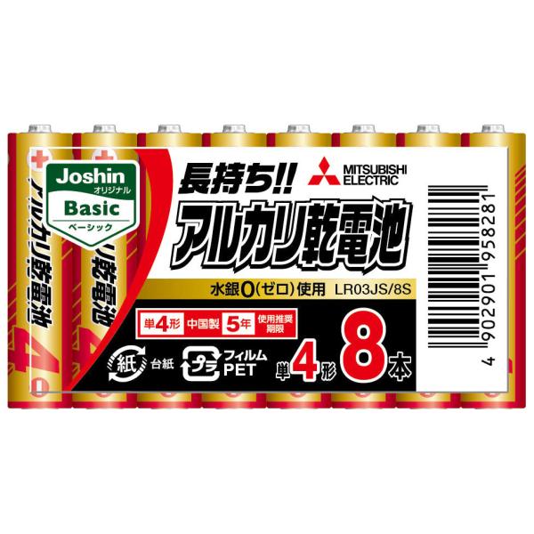三菱 アルカリ乾電池単4形 8本パック MITSUBISHI Joshin オリジナル Basic LR03JS/ 8S 返品種別A